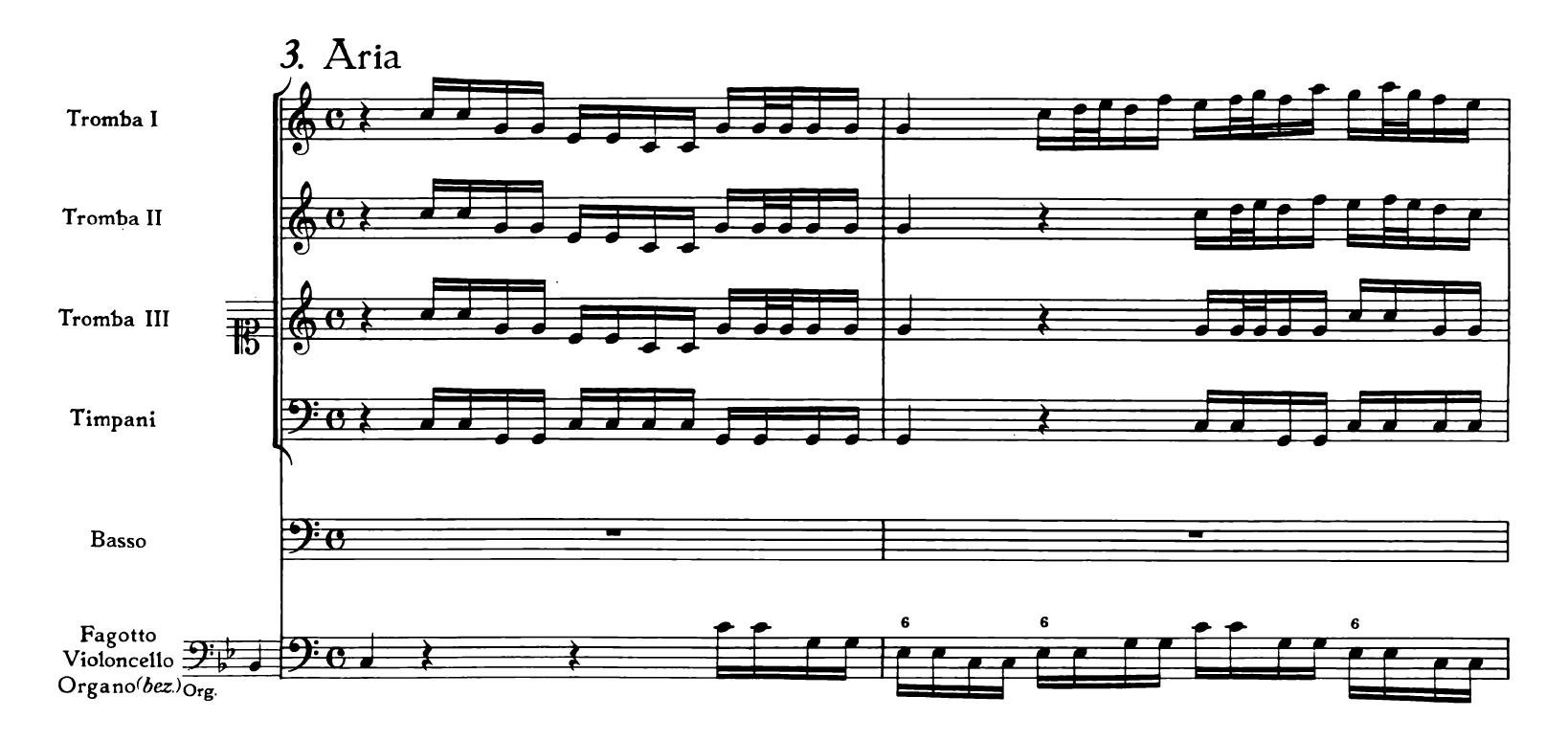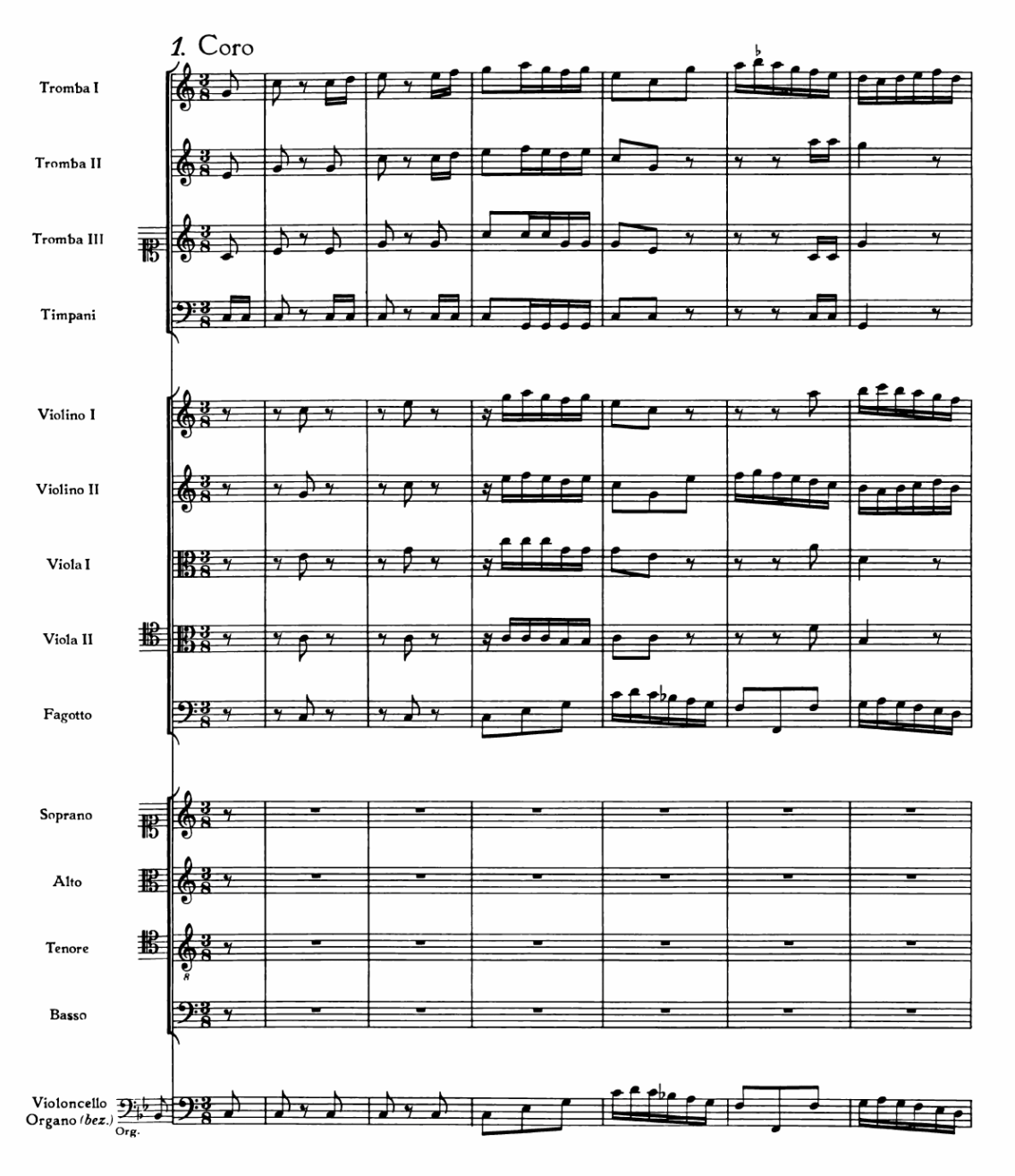 編成:SATB, 合唱; Tp3, Timp, Ob, Vn1, Vn2, Va1, Va2, Fg, bc.