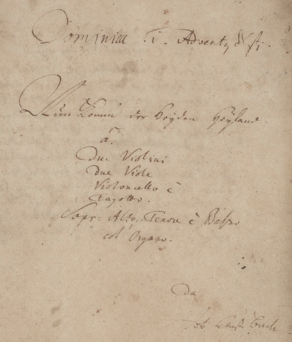 Dominica. 1. Adventus Xsti. / Nun komm’ der Heyden Heyland. / à 1 / due Violini / due Viole / Violoncello e / Fagotto. / Sopr: Alto, Tenore e Baßo / col’ Organo. / da / Joh: Sebast: Bach / a[n]no. 1714.