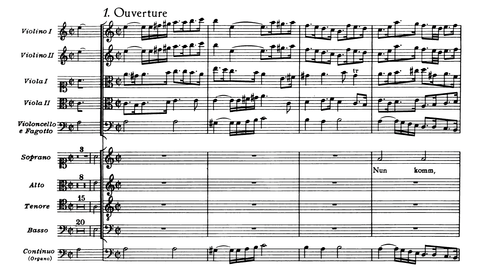 バッハはこの伝統的コラール旋律をフランス序曲Ouverture)の形式に組み込み、ここではそれを天の王の入城の象徴として扱い、教会暦の開幕にふさわしい、同時に異例で壮麗な序曲的楽章を生み出しています。フランス風スタイルは、ヴィオラ2本を含む五部の弦楽編成の採用からもうかがうことができます。