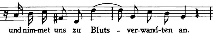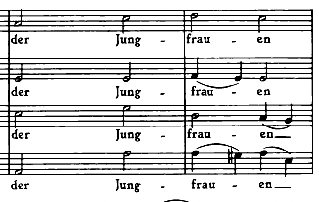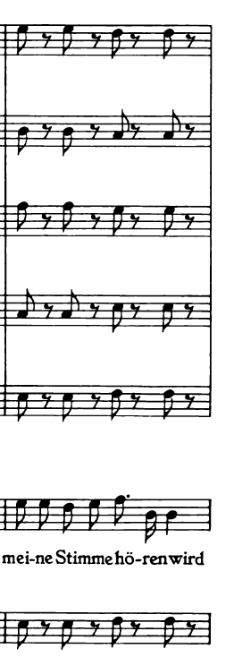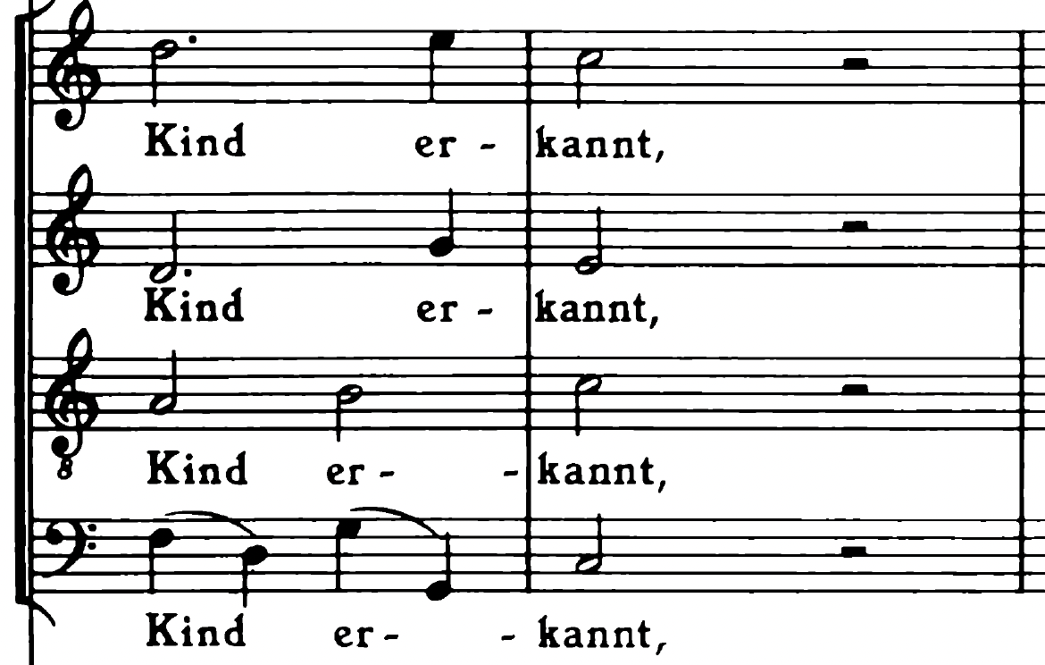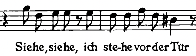 「Siehe(見よ)」は二度現れます。最初は強い呼びかけとして、二度目は落ち着いて歌われます。音高の違いがそのニュアンスを描き分けています。