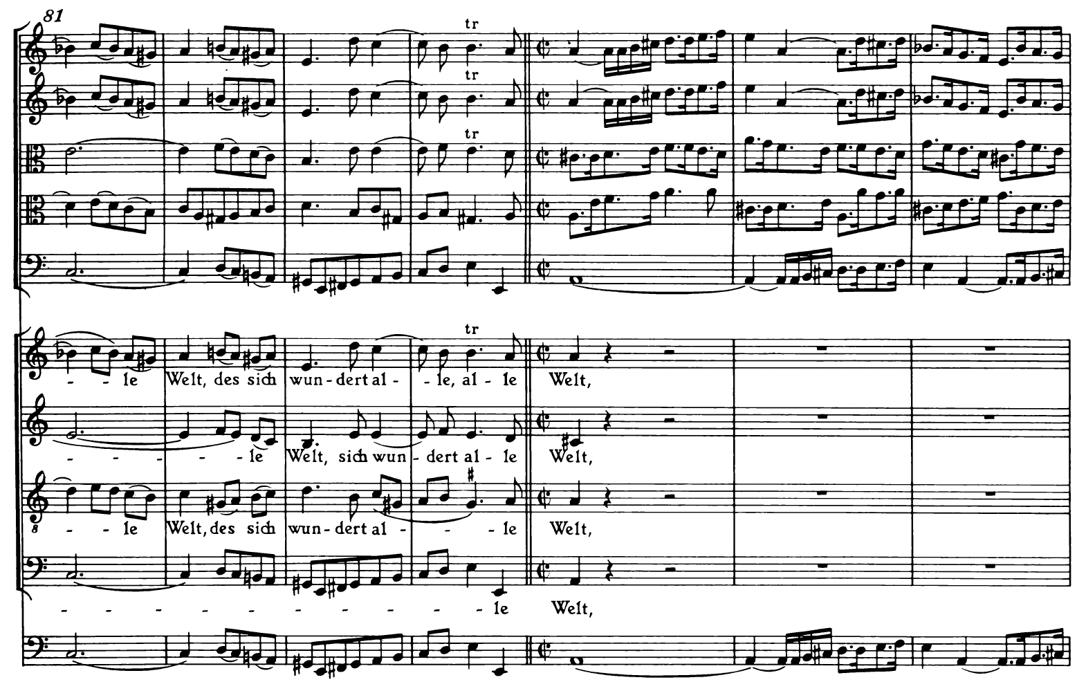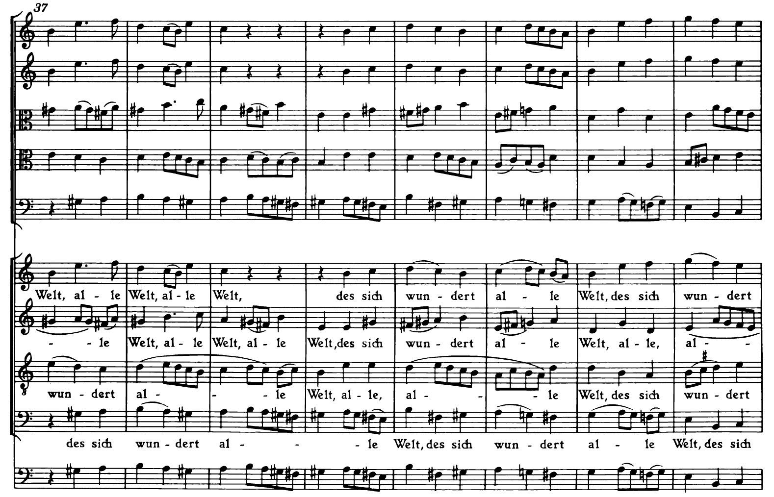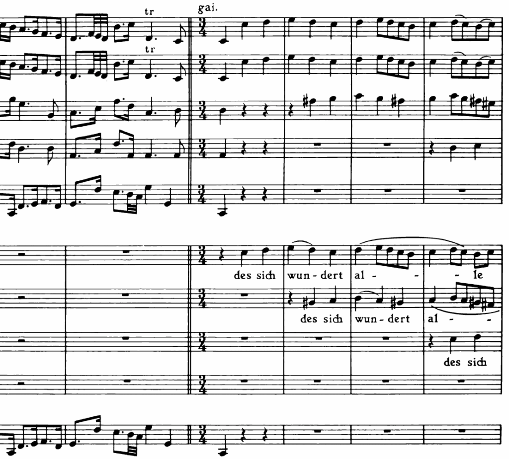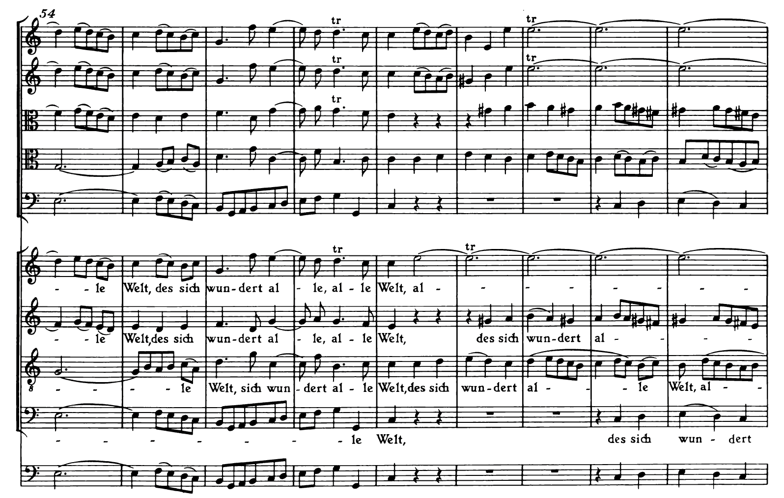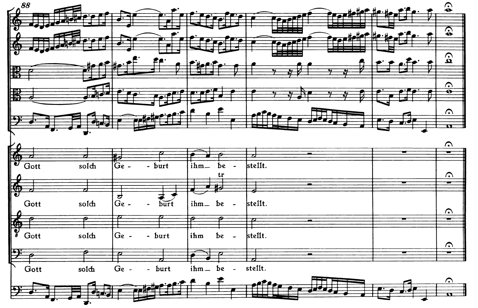 バッハは原旋律を用いてこれをコラールとして作曲しましたが、ヴァイオリンのオブリガートは予想されるソプラノの補強ではなく独立した旋律が与えられ、結果としてこの終曲も冒頭合唱と同様に五声的な書法となっています。