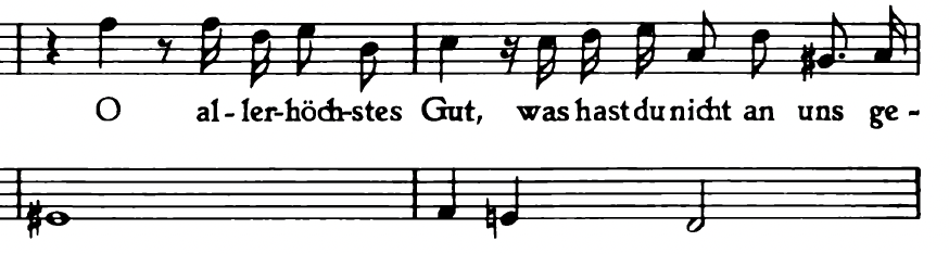 その後、ソプラノとアルト、バスの順番でルターのコラールの第1行が歌われます。