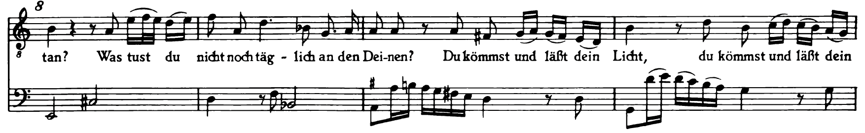 第6曲(Choral):Ph. ニコライのコラール「輝く曙の明星のいと美わしきかな」(1599)最終節後半(定旋律 = BWV 436)。