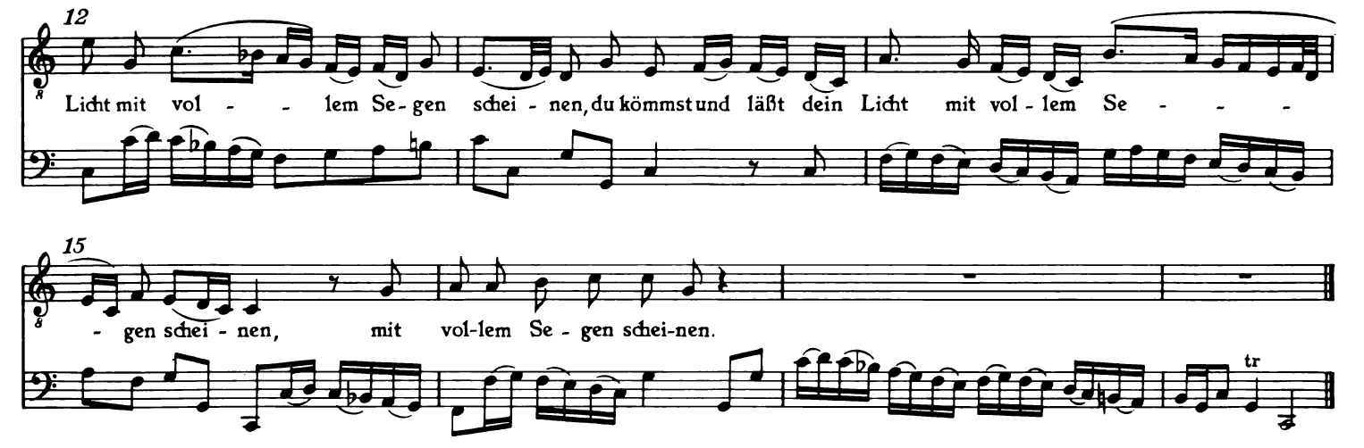 ノイマイスターはカンタータの結びに、フィリップ・ニコライ作のコラール〈Wie schön leuchtet der Morgenstern(輝く曙の明星のいと美わしきかな)〉から半詩節を据えました。