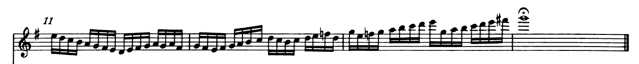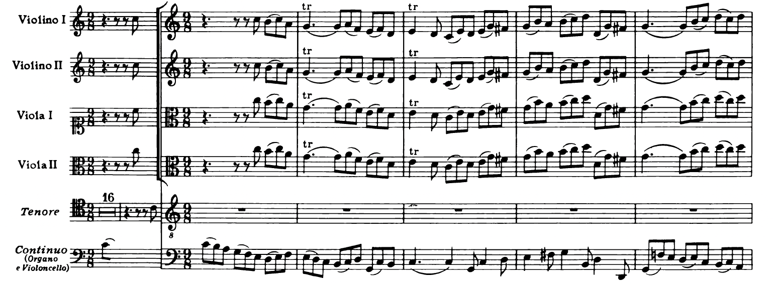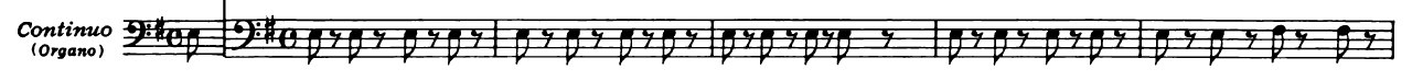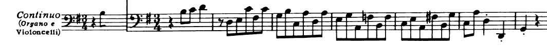 4度のハーモニーが鳴るだけでなく、全体の調性が **ハ長調** で書かれているのが興味深い点です。通奏低音がハ音へと駆け上がった後、再び低音へと広がり、充実した和音で終止を迎えます。