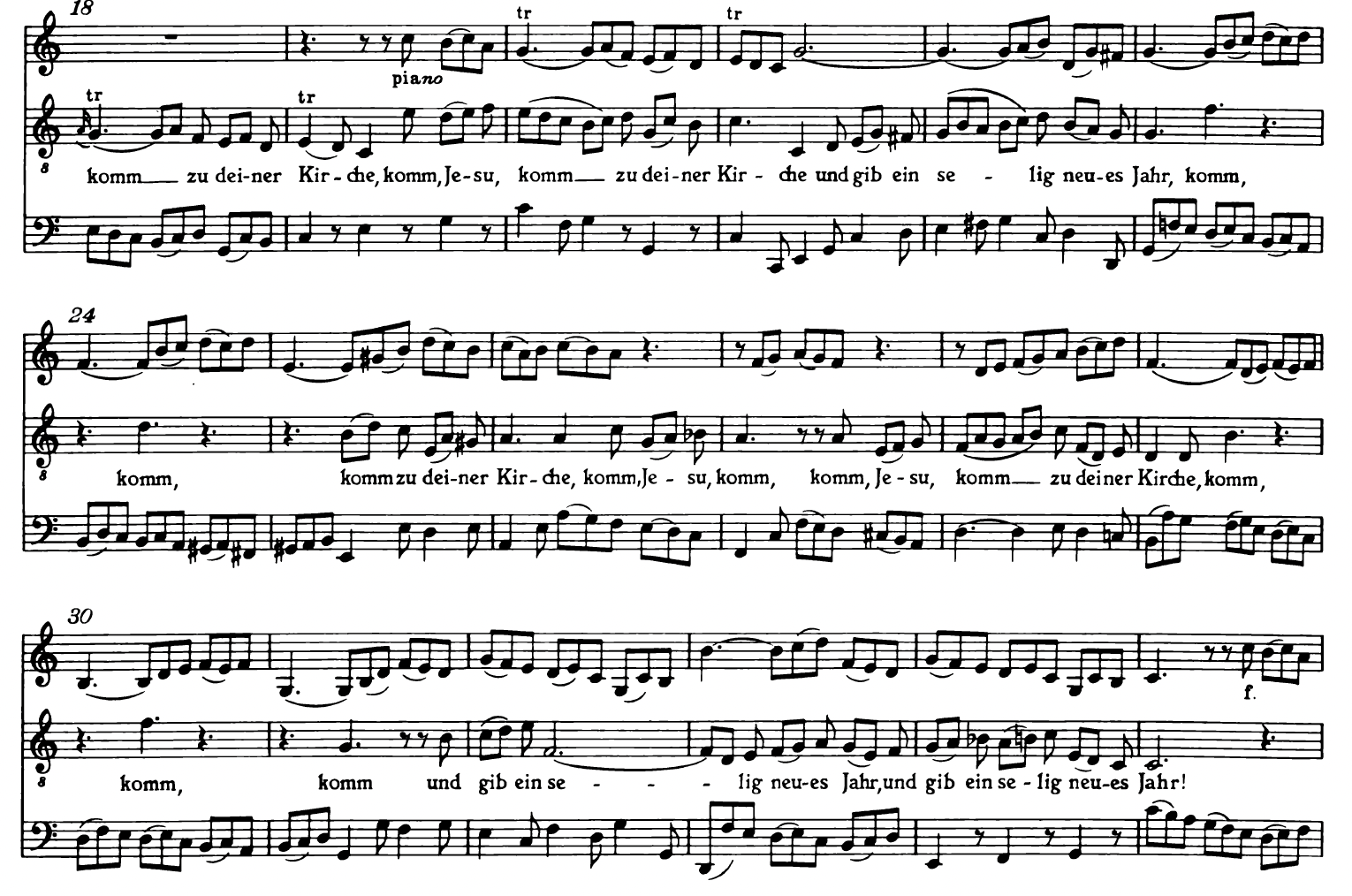 第2曲と第3曲は内容上も結び付いており、バッハは両曲をテノール独唱に割り当て、自筆譜の記譜が示すとおり無休止で連続させています。レチタティーヴォは救い主の誕生と、その来臨が信徒にもたらす喜びを述べ、続くアリアはイエスへの直接の呼びかけとして「新しい年への祝福」を願い求めます。