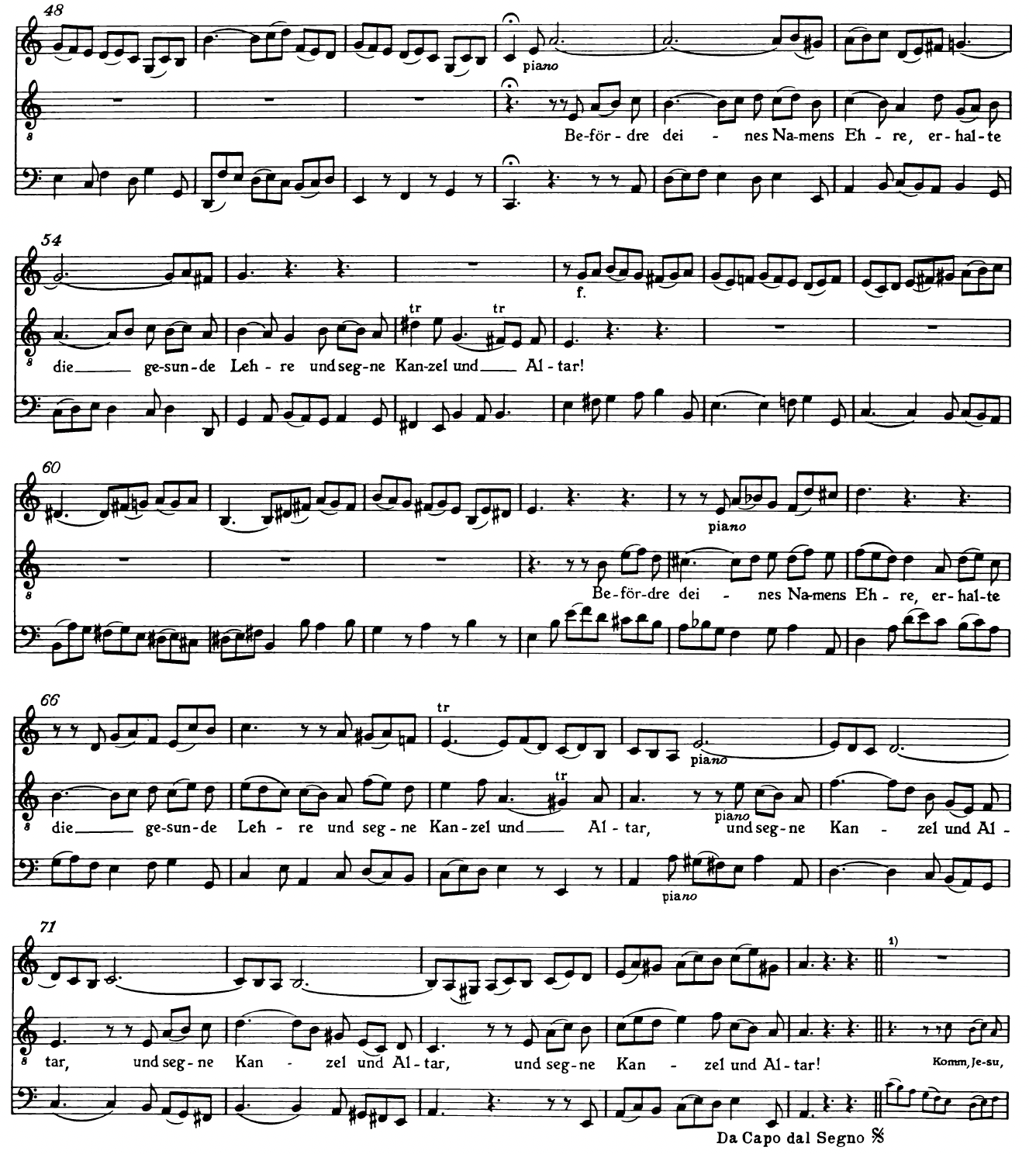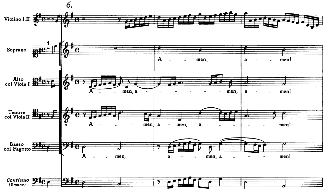 冒頭では、バスと通奏低音がコラール旋律の「Amen」を先導し、それに導かれるようにソプラノが同旋律を受け継いで歌います。