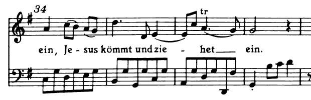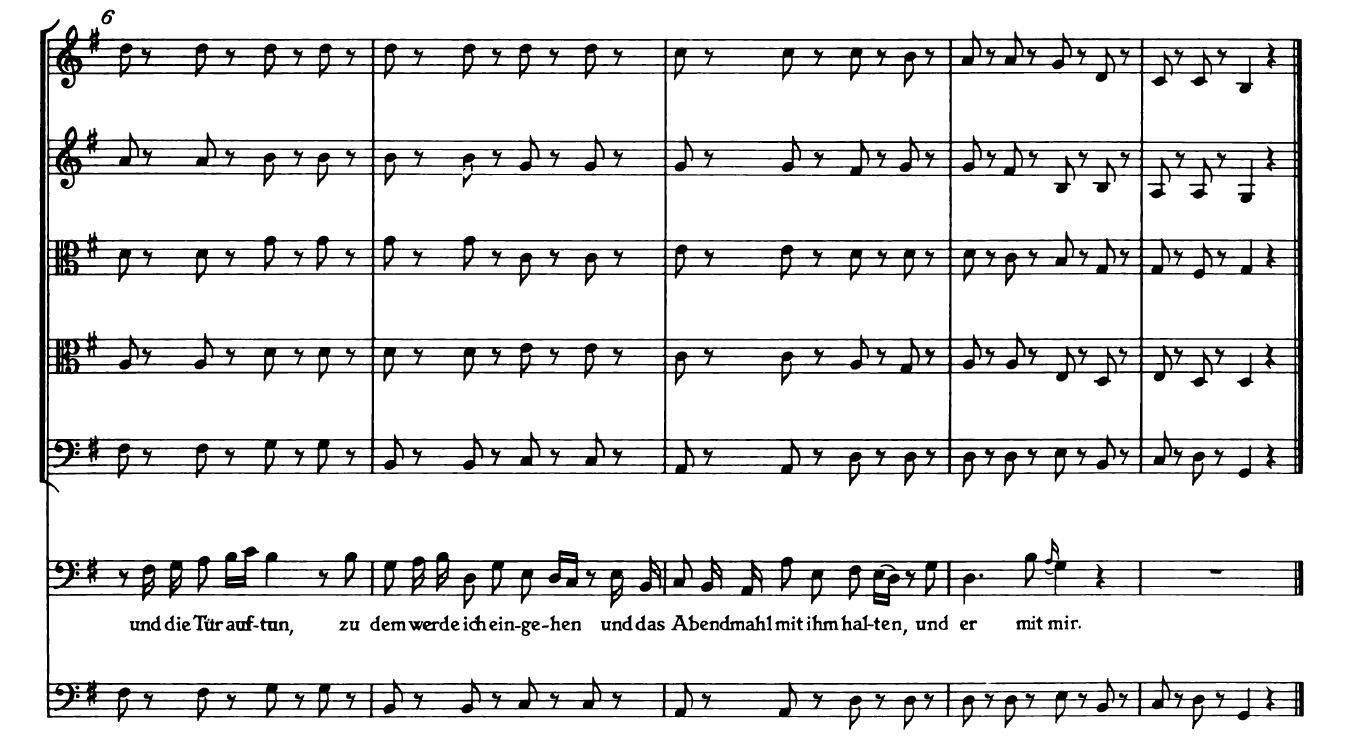 5小節後半の「hören wird(聞こえるならば)」から和声がほどけ、**ト長調(G-Dur)**へと穏やかに移行します。扉を開いた者とイエスとの関係が和らぎ、好意と親しい交わりへ招き入れられていく気配を示しているかのようです。