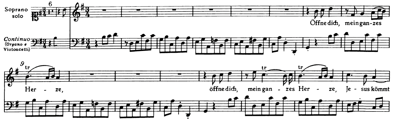 冒頭の通奏低音は、ソプラノの「Öffne dich」の旋律を先取りして提示します。