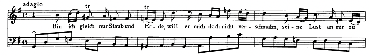 「Bin ich gleich nur Staub und Erde(私は塵にすぎない者ですが)」の箇所では、旋律が意図的に低い音域に据えられているように感じます。