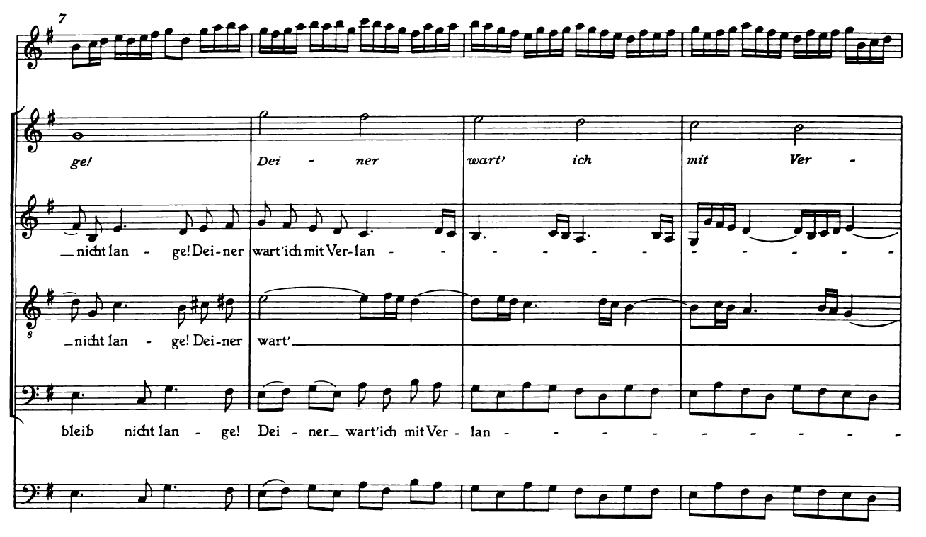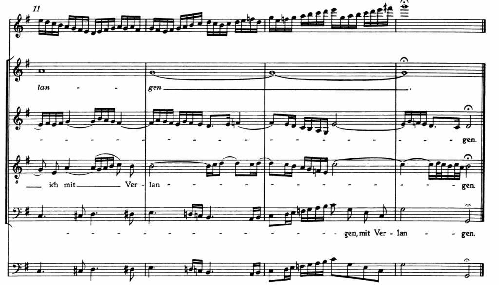 通奏低音は E音(ミ)5小節目の第二拍まで頑として保持します。その不動の基盤は、イエスの威厳――岩のごとく動じない堂々たるお姿――を象徴しているように思われます。