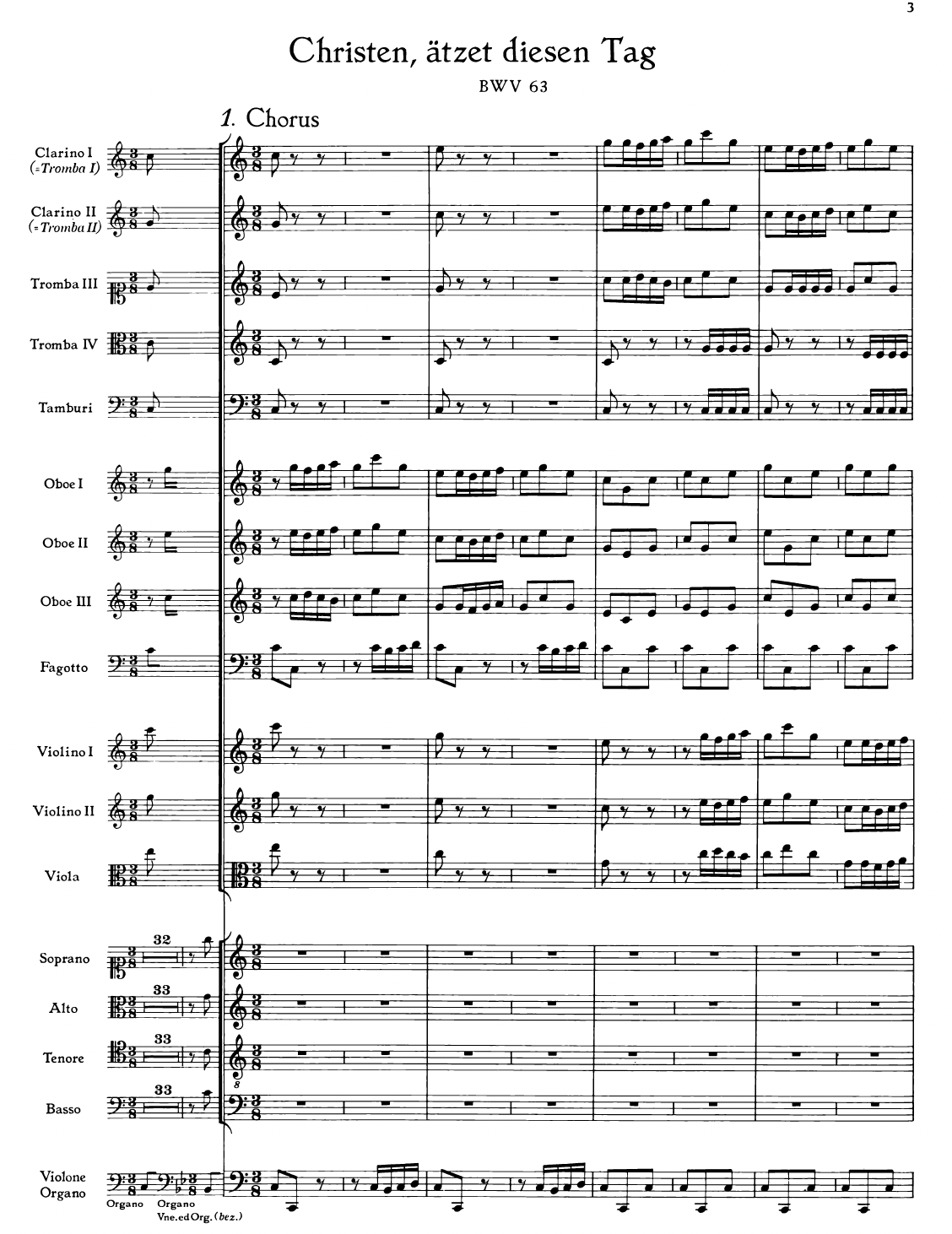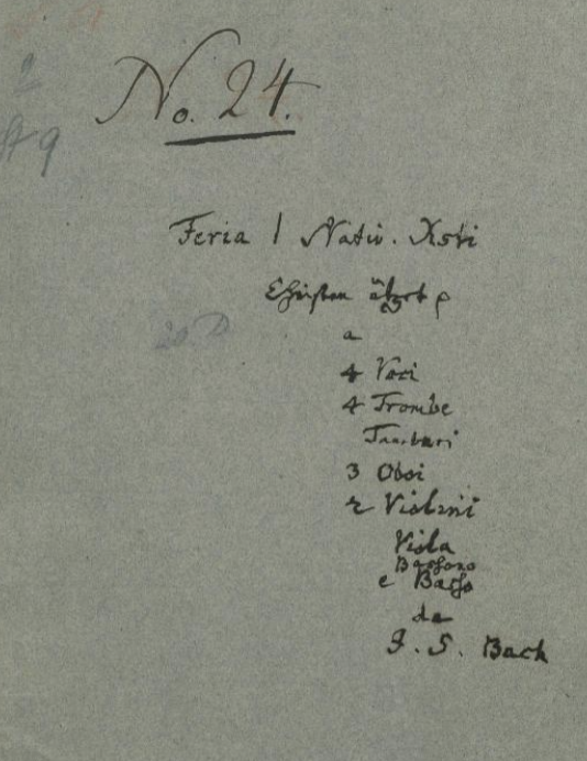 Feria 1 Nativ. Xsti / Christen ätzet etc. / a 4 / 4 Voci / 4 Trombe / Tamburi / 3 Oboi / 2 Violini / Viola / [のちに追記:Bassono] / e Basso / da J. S. Bach.