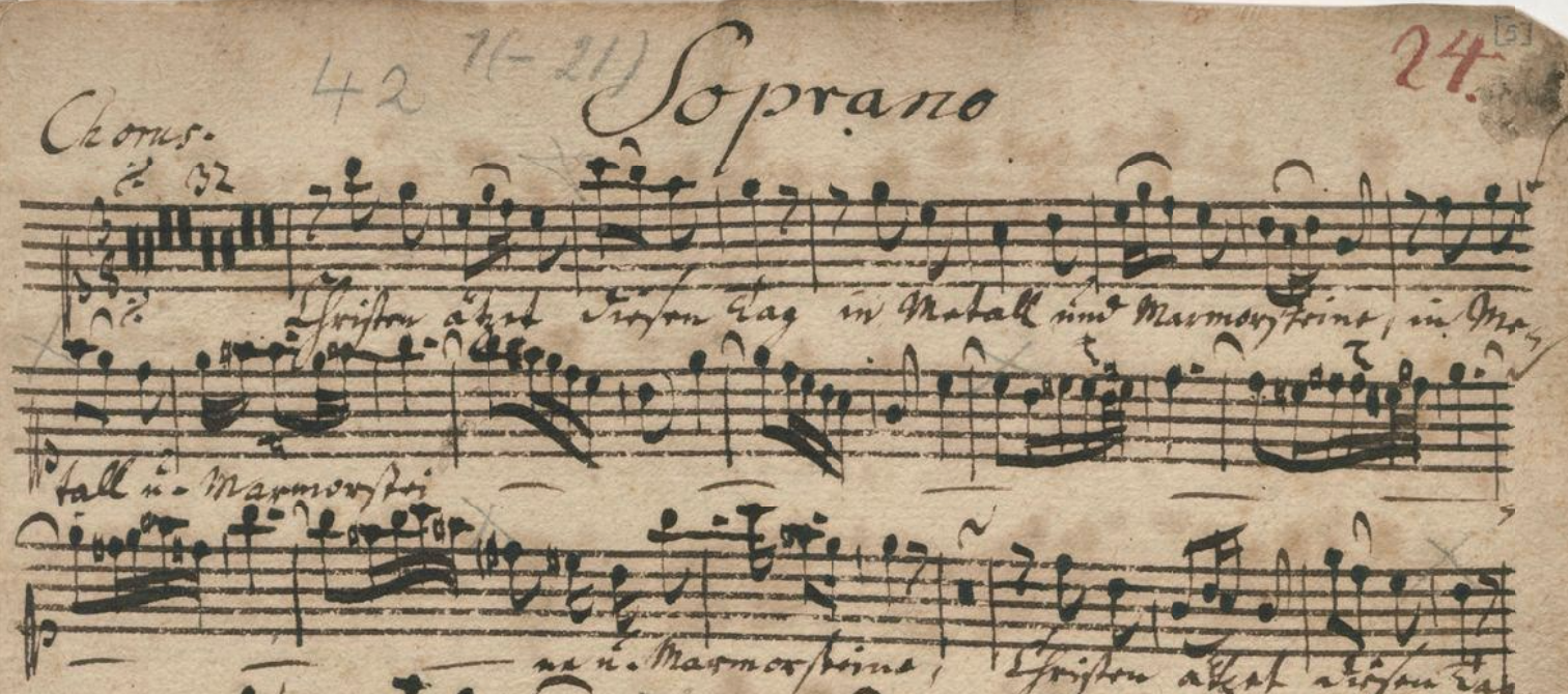 写譜はバッハ自身と、その助手(おそらく弟子のヨハン・マルティン・シューバルト〔1690–1721〕)が分担しました。