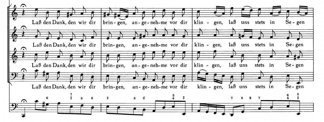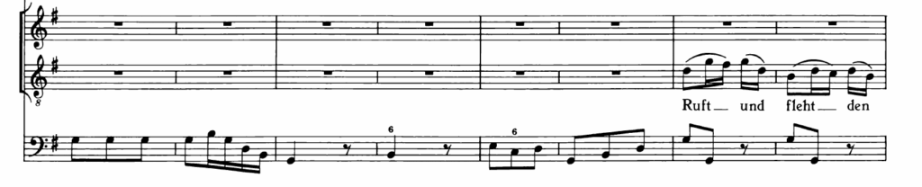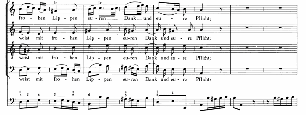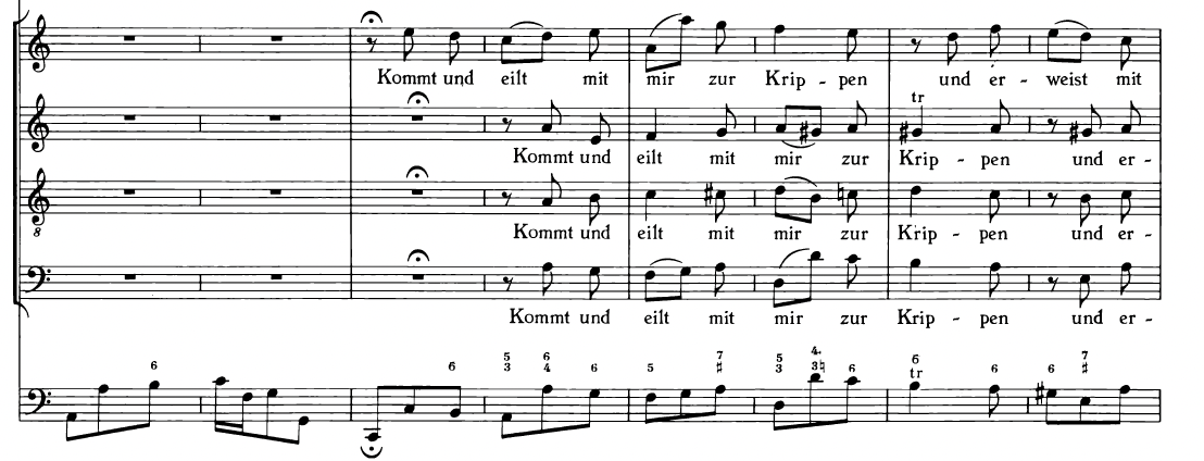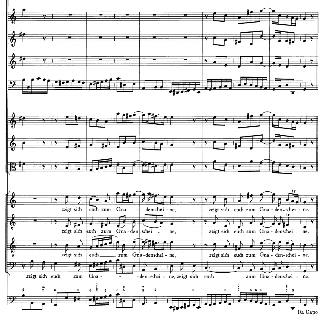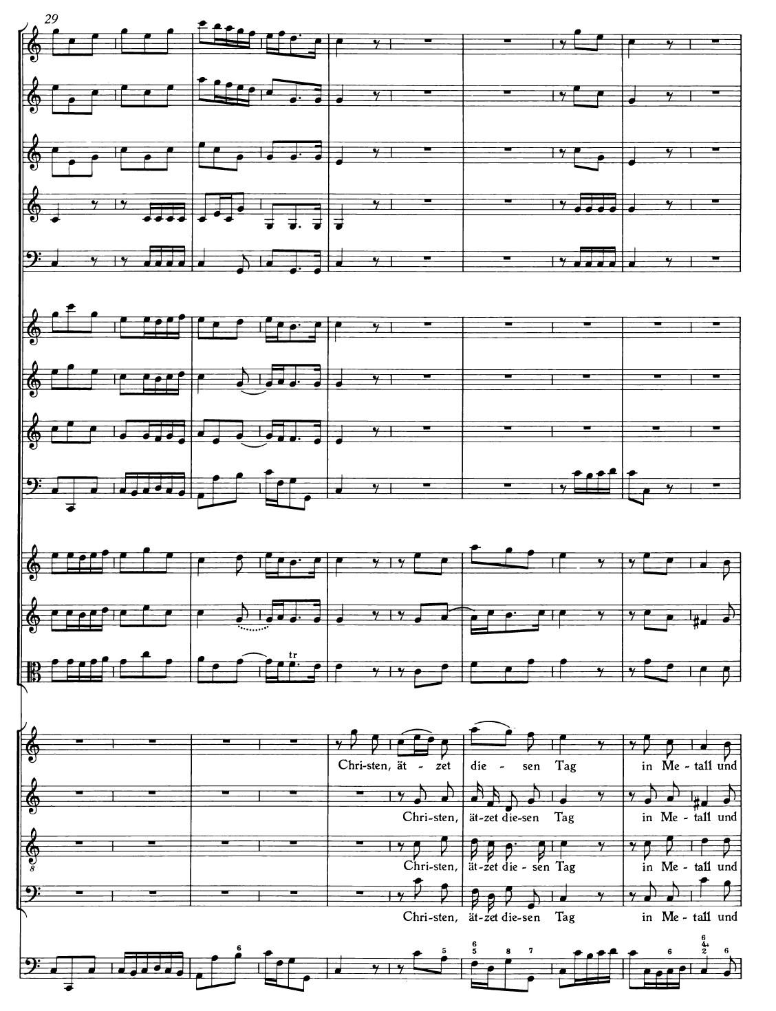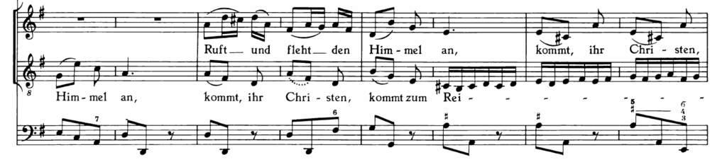 キリスト者に呼びかける「天の声」のように、ソプラノは「Christen(キリスト者)」を下降音形で一拍早く歌い出し、それに呼応して他のパートが続きます。