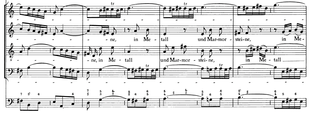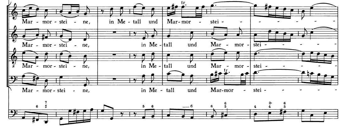 「Marmorstein(大理石)」の箇所はメリスマで長く引き延ばされ、最硬の石に刻み込む労苦を想起させます。