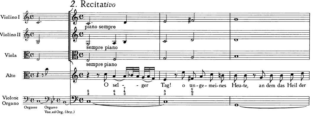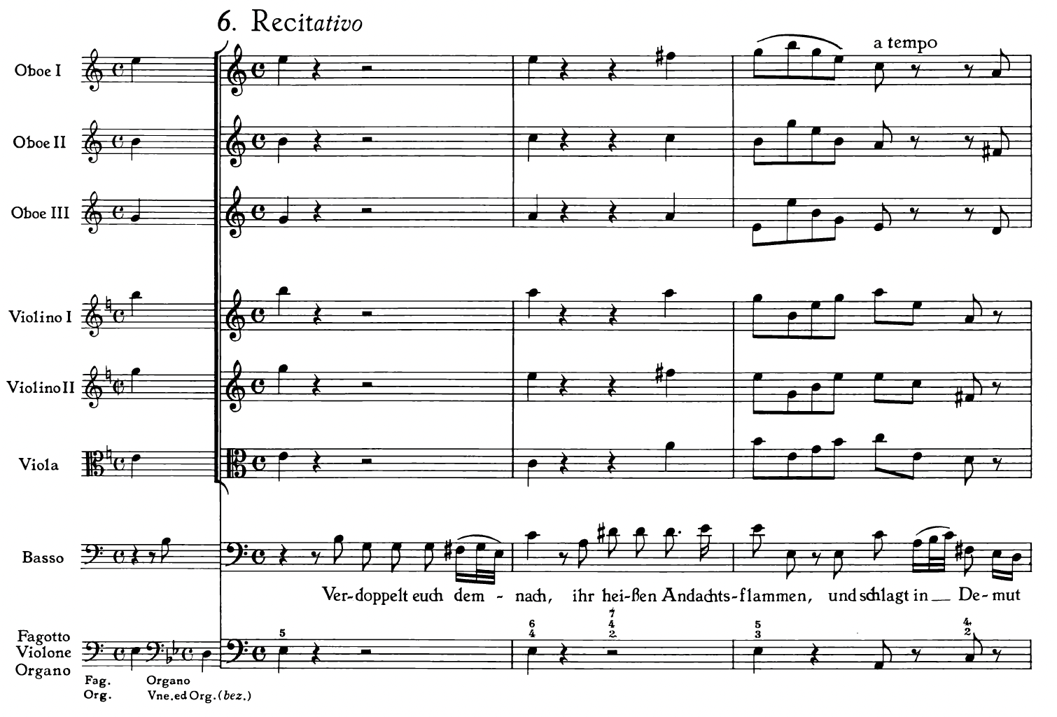 前のレチタティーヴォは弦楽器が伴奏し、後のレチタティーヴォは弦楽器に加えてオーボエ(木管楽器)が伴奏します。それぞれの響きの違いが、曲にキャラクターを与えています。