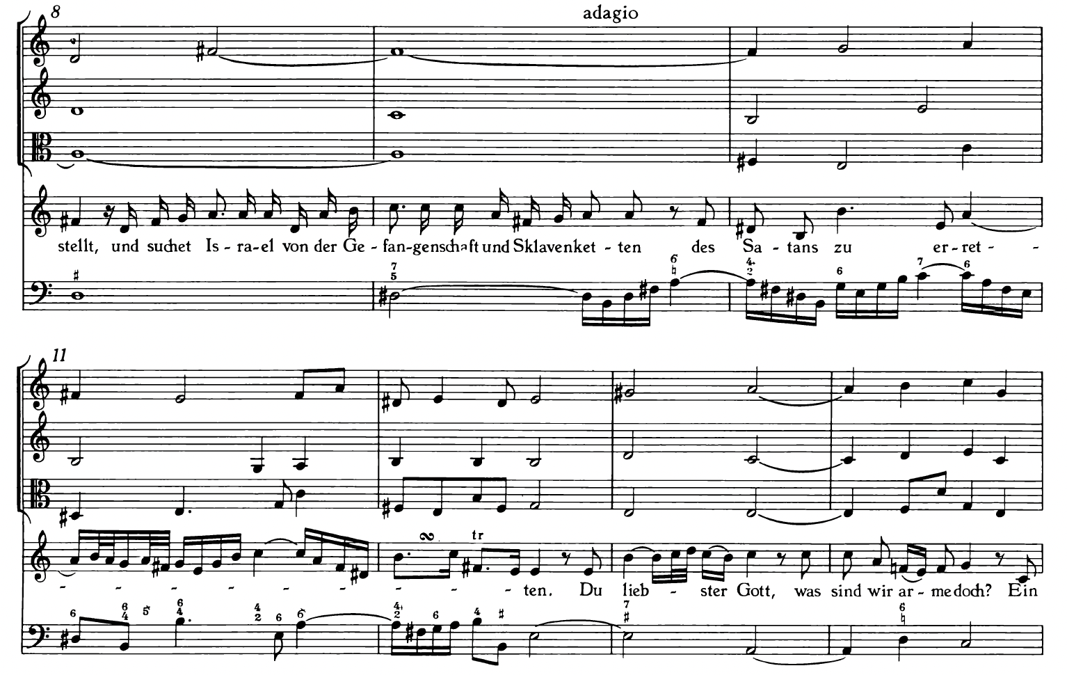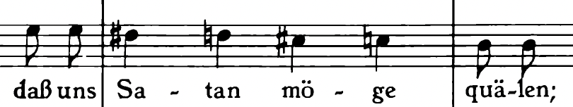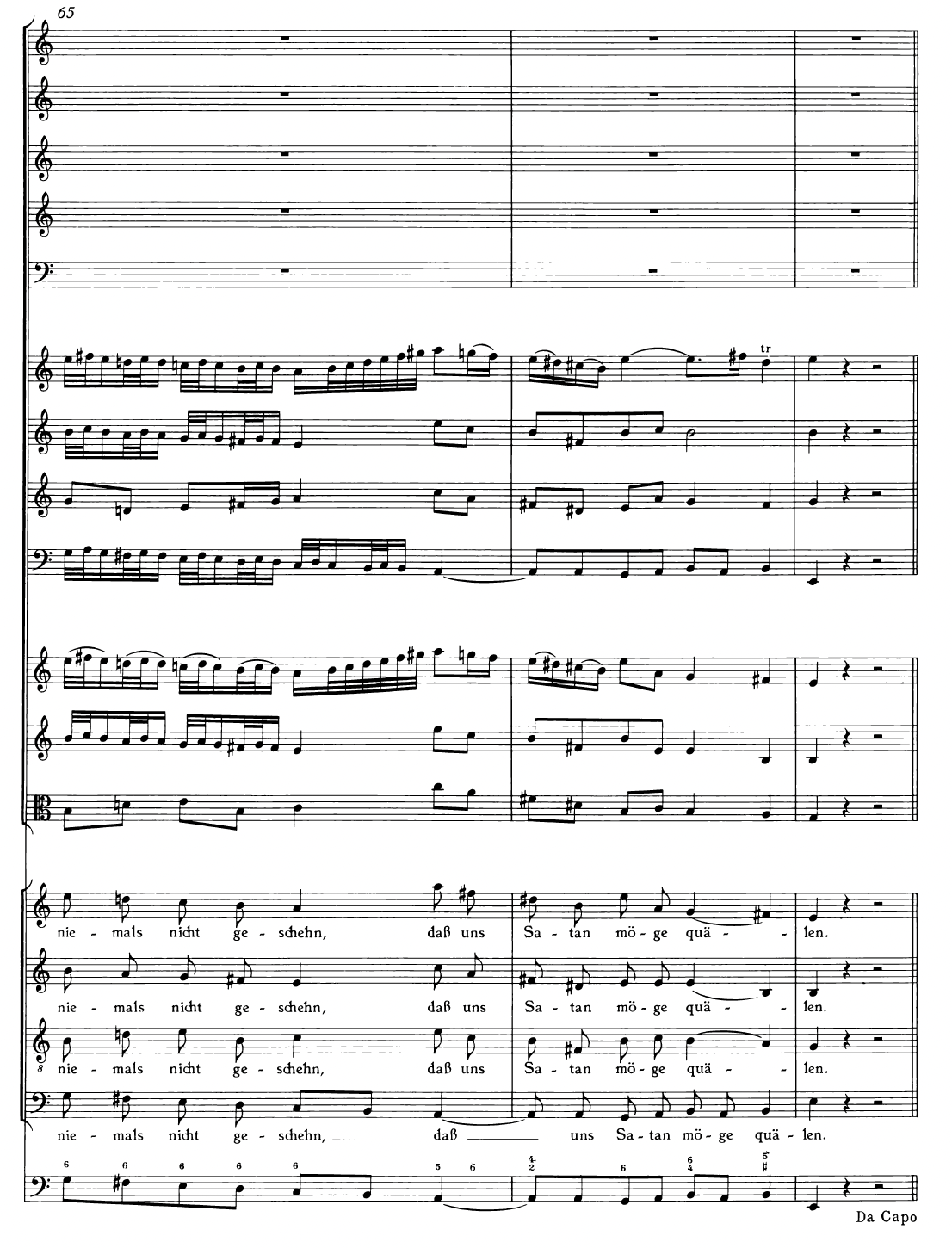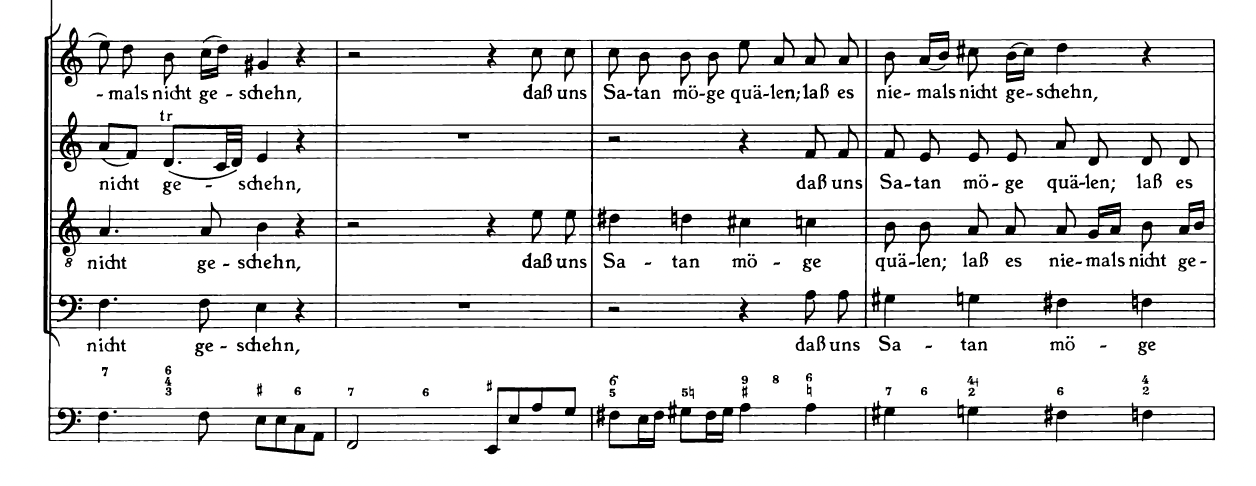 「Dass uns der Satan möge quälen(サタンが私たちを苦しめることがありませんように)」を歌う箇所は、対位法的な書法の中に登場する(サタンによる)苦しみの半音進行(クロマティック)が特徴的です。
