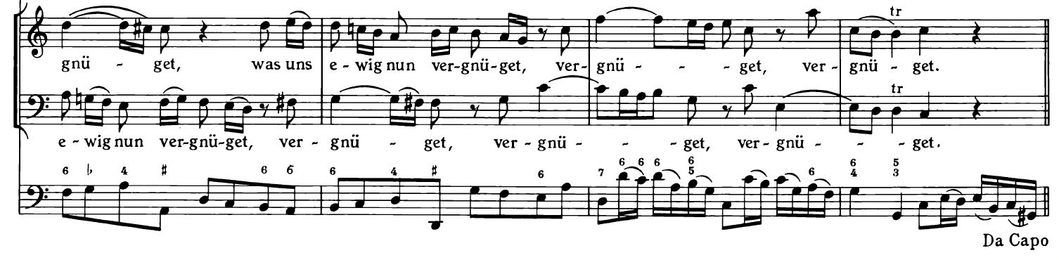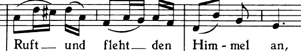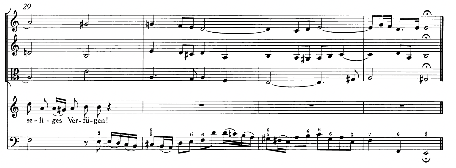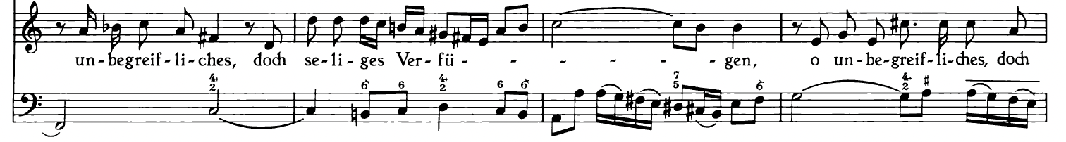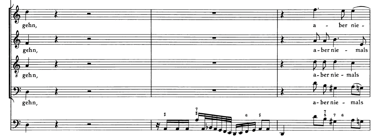 「Aber niemals nicht geschehn(しかし、決して起こらぬように)」の箇所では、半音階的に下降するバス声部の上で、7 → 6 の和音の進行三度繰り返されます。