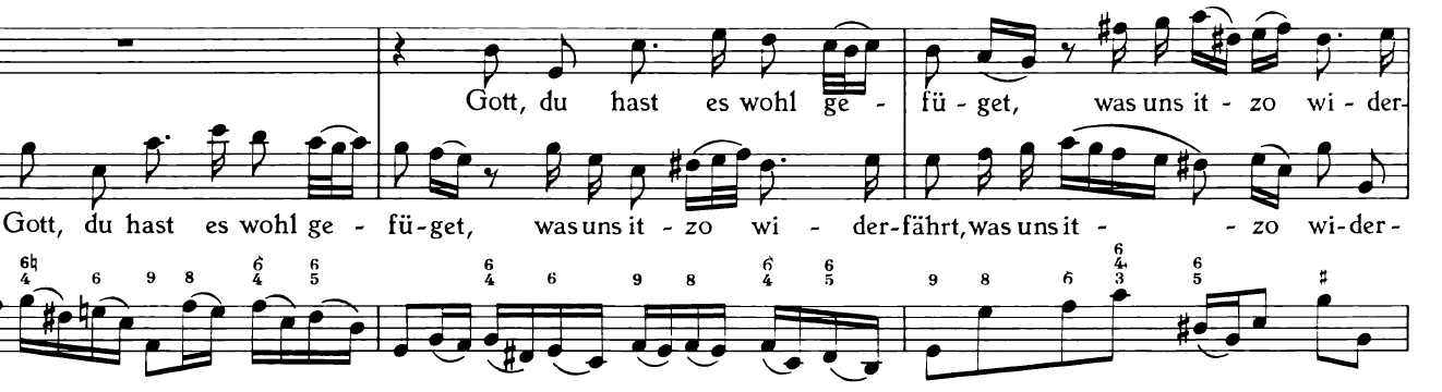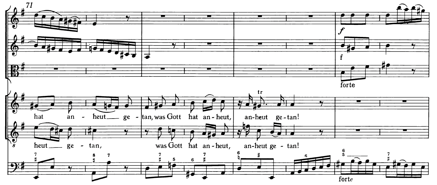 「Was Gott hat anheut getan!(今日、神が私たちにしてくださったことを!)」の句から徐々に、音楽は短調へと転調していきます。