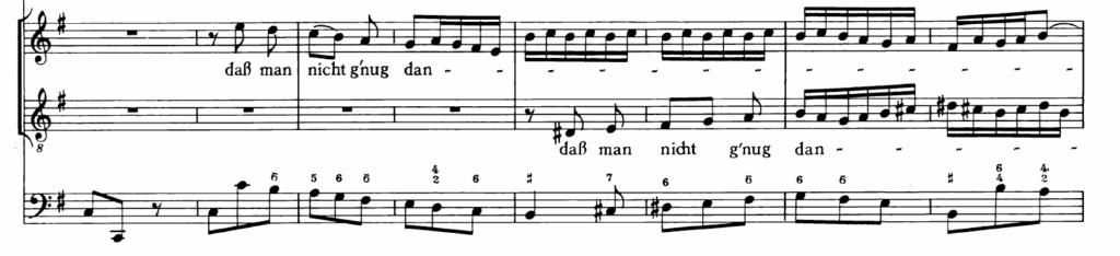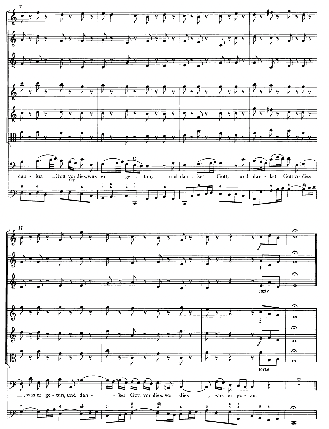 「Und danket Gott vor dies, was er getan!(神に感謝しよう、主のなされたことに)」の句は三度繰り返され、神学的象徴である――とりわけ三位一体――が強調されます。
