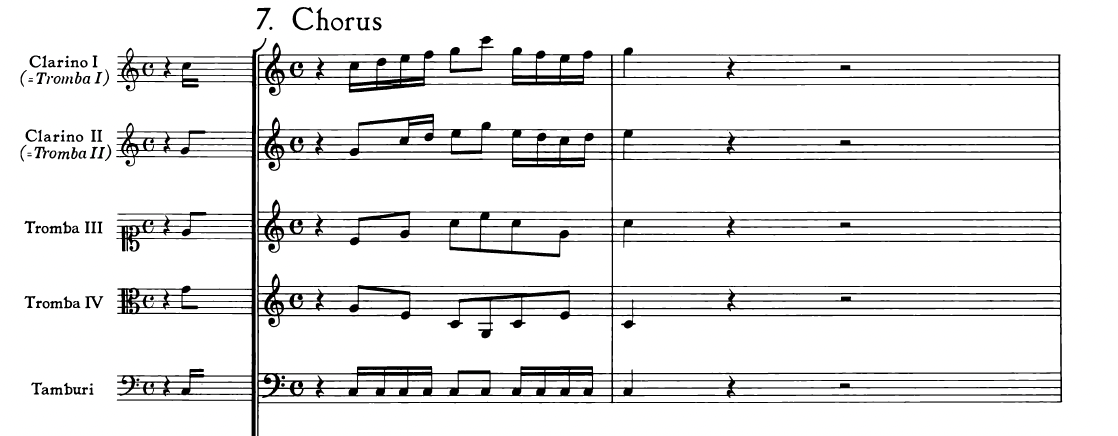 編成:SATB, 合唱; Tp4, Timp, Ob3, Vn1, Vn2, Va, Fg, bc.