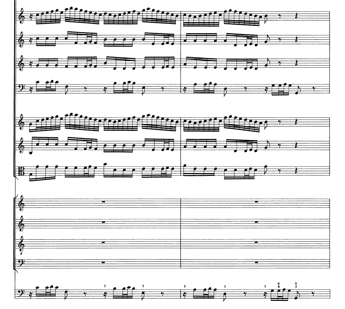 書法もここまでの流れと一貫しており、カノンで始まった二声が徐々に歩調を揃えて合流し同じ音形で終止します。