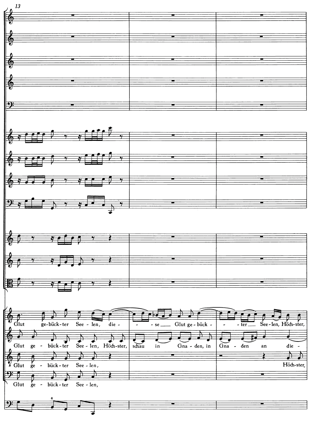 第13小節からフーガとなります。「die Glut gebückter Seelen(ひざまずく魂の炎)」の歌詞が歌われますが、声部が徐々に増えていく様は魂の炎がしだいに大きく燃え上がるようです。