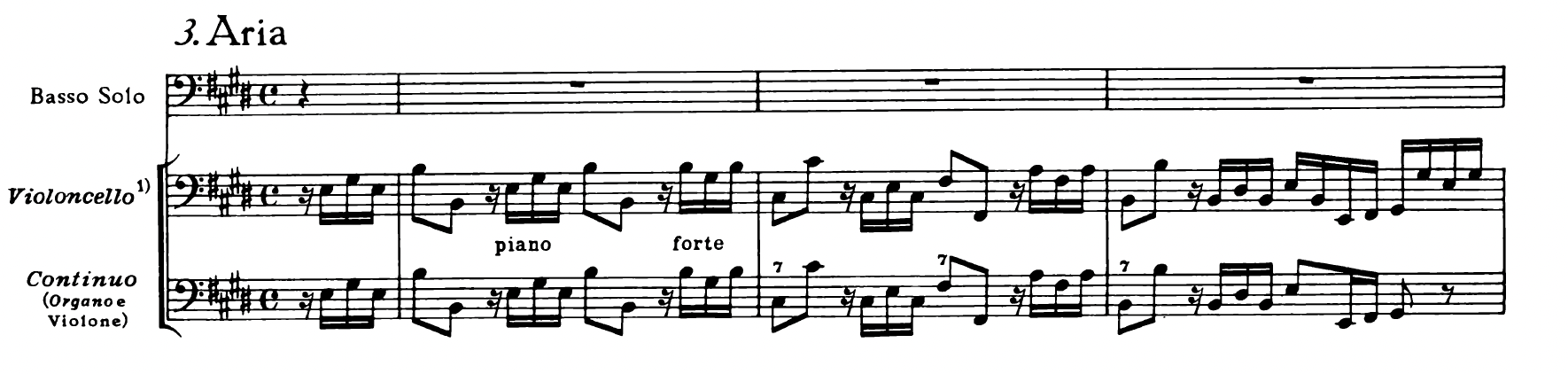 続く第3曲はファゴットをともなった通奏低音とバス、すなわち「バスとバス」という、後の《マニフィカート》やカンタータ第10番でおなじみの編成によって演奏される。